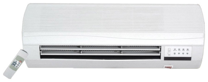 Heater type: fan heater, room area: 20 m², installation: wall-mounted, features: display, remote control, temperature control, timer, heating element type: ceramic
