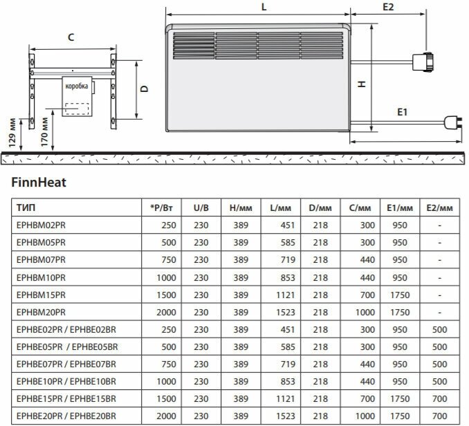Description: Type of heater: convector, room area: 7 m², installation: wall-mounted, protection systems: shutdown in case of overheating, control: electronic, features: thermostat, height: 38.90 cm, width: 58.50 cm, weight: 3.51 kg