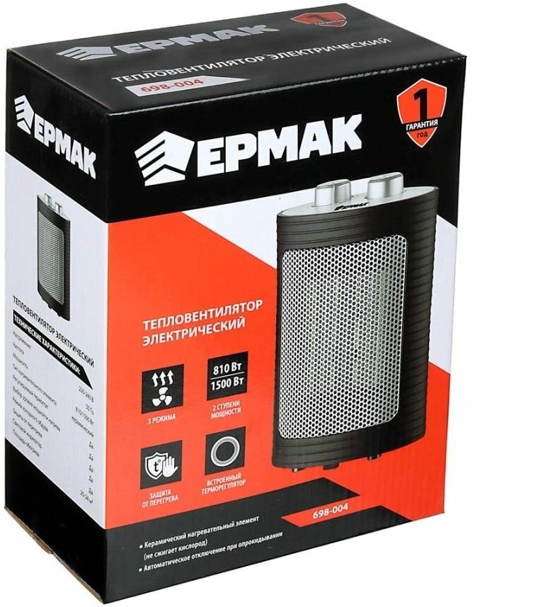 Heater type: fan heater, room area: 24 m², installation: floor, protection systems: tip-over shutdown, overheating shutdown, control: mechanical, features: temperature control,