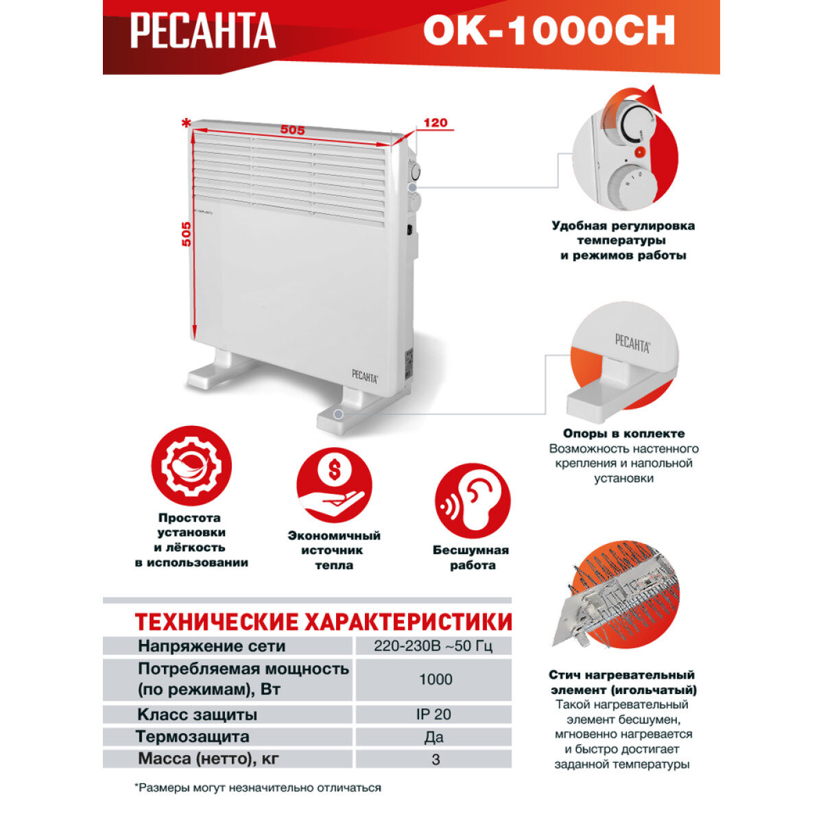 Convector, supports, wall-mounting kit, instruction sheet, packaging