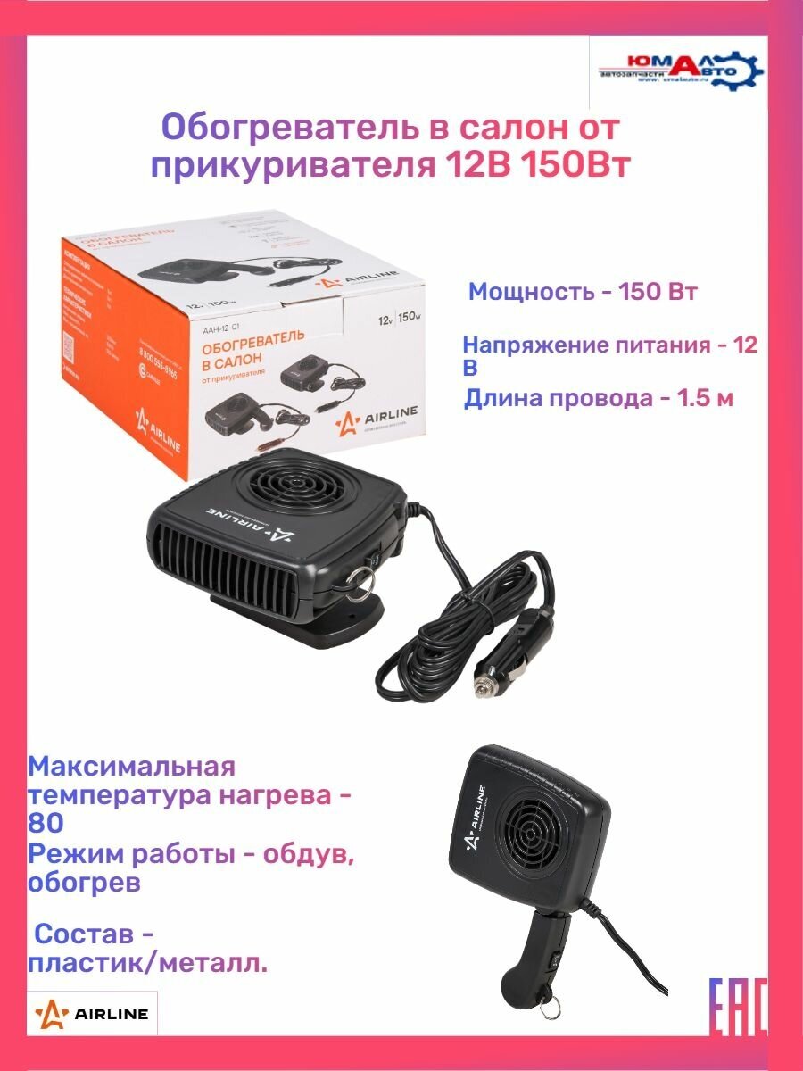 Vehicle type: cars, type: interior heater, type of heater: electric, type of heating: air, supply voltage: 12 V, from cigarette lighter 12V 150W, features: interior heating