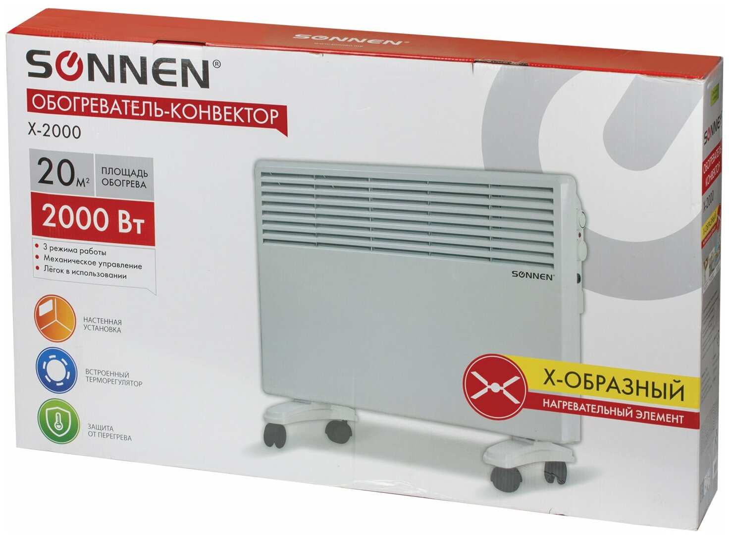 Type of heater: convector, room area: 20 m², power consumption: 2 kW, installation: floor, wall, protection systems: shutdown in case of overheating, control: mechanical, features: temperature control