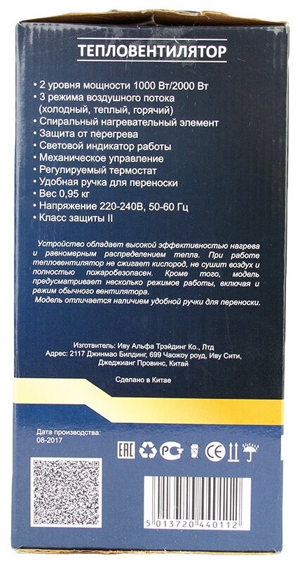 Heater type: fan heater, protection systems: tip-over shutdown, control: mechanical, features: thermostat, heating element type: spiral, weight: 0.95 kg