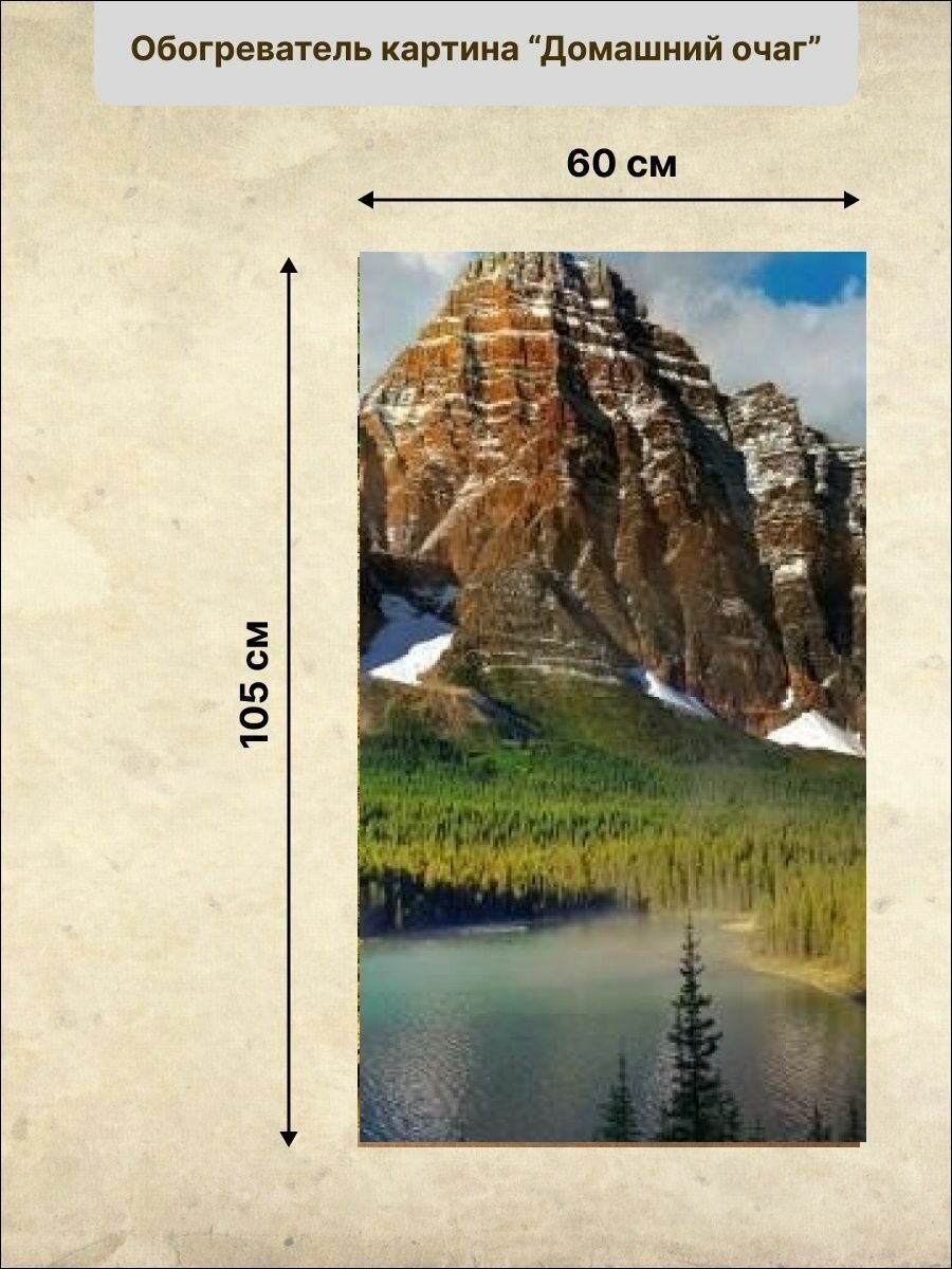 Drawing - mountains; unfolded dimensions - 105 x 60 x 0.05 cm; power consumption - 500 W; surface temperature - 65 °C; operating mode - without restrictions; power source - network 220 V; power cord length - 1 meter; dimensions in folded