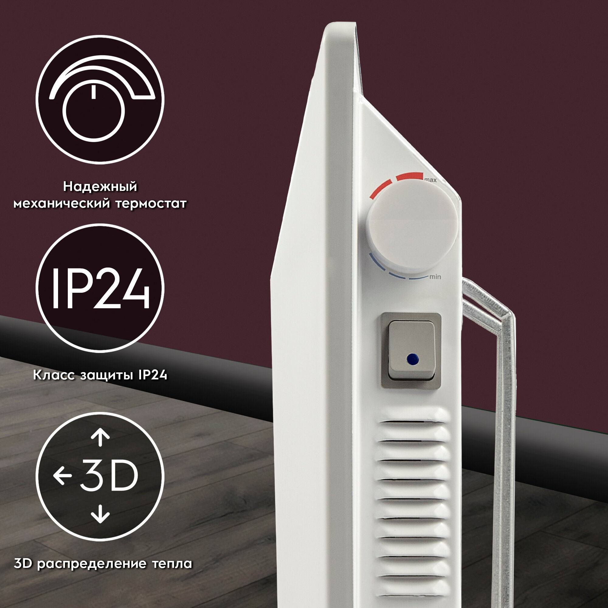 Description: Type of heater: convector, room area: 20 m², power consumption: 1.50 kW, installation: floor, wall, protection systems: tip-over shutdown, overheating shutdown, control: mechanical, special