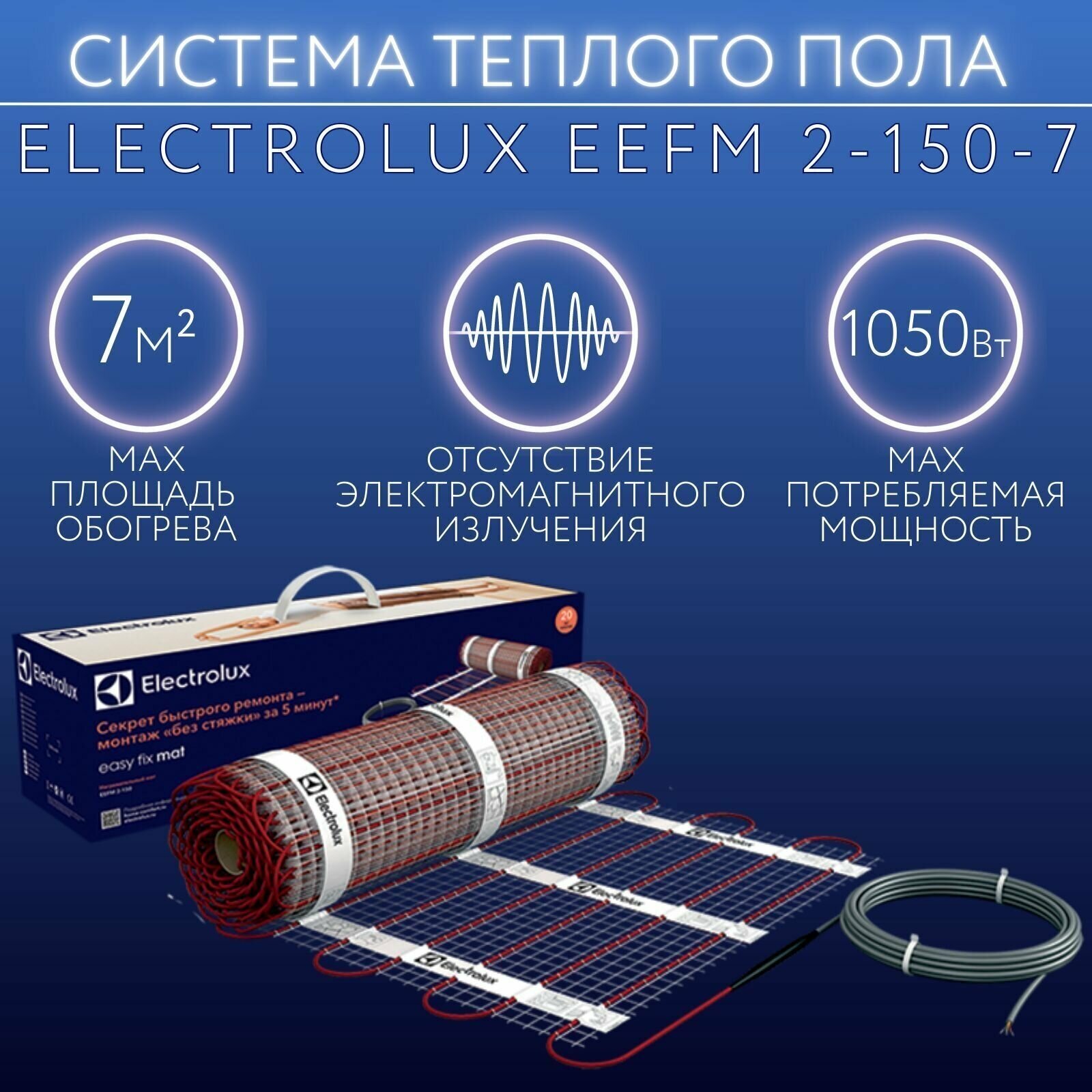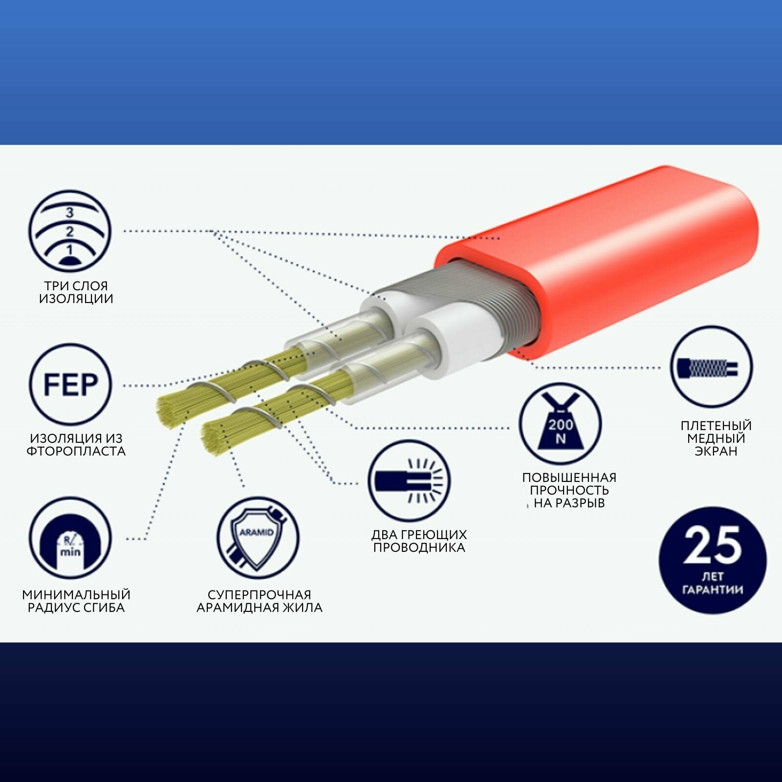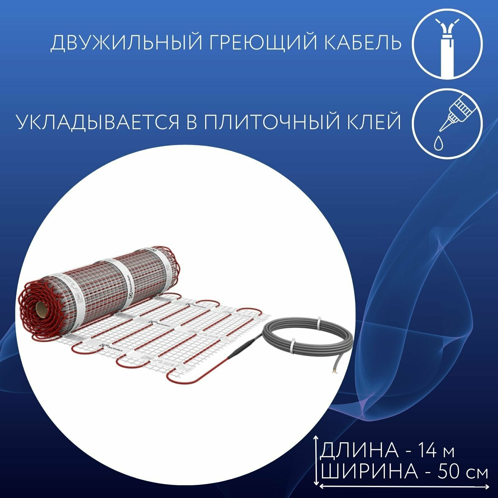 Three layers of insulation; increased tensile strength; two heating conductors; degree of protection IPX7; mat thickness 3.5 mm; cable pitch 7.4 cm