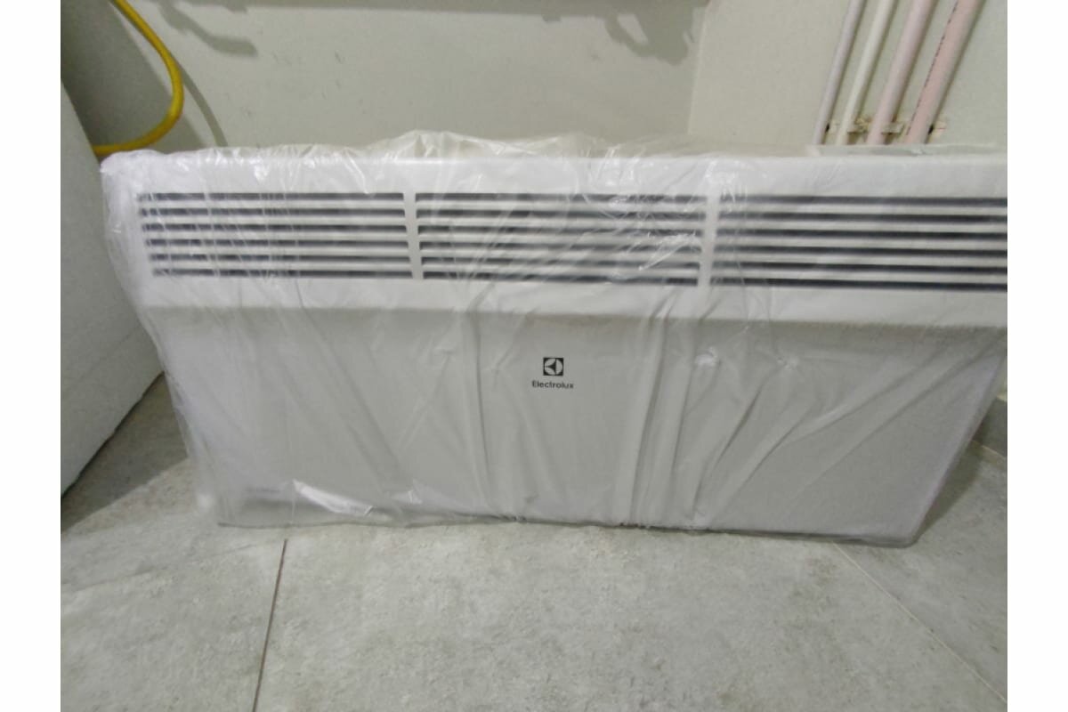 Heater, wall mounting bracket, mounting bolts, set of caster feet, mounting template