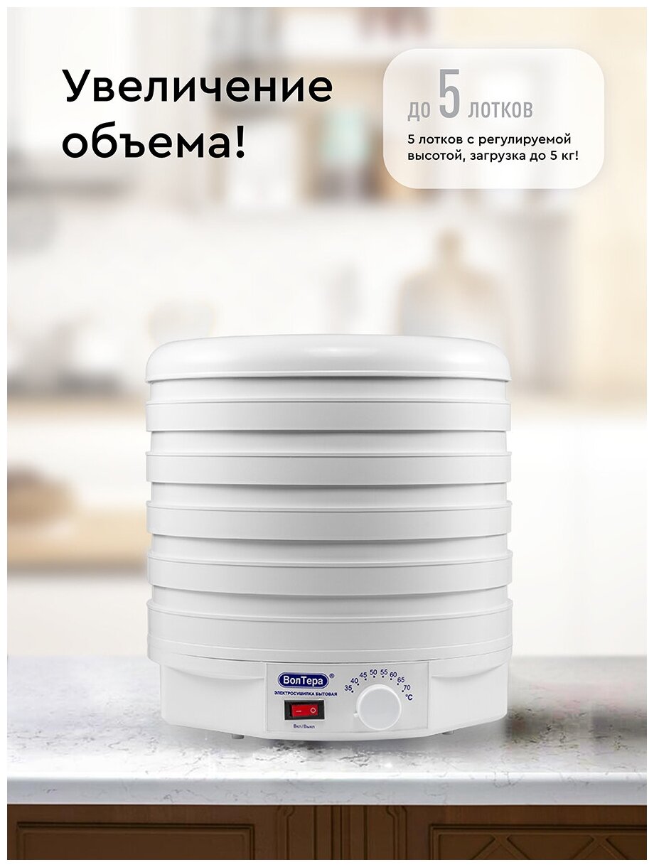 Type: convective, tray material: opaque plastic, number of trays: 5, power: 300 W, drying temperature control, control: mechanical, features: overheating protection