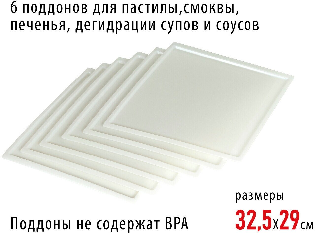 6 stainless steel trays, 6 trays for small products herbs, nuts, 6 trays for marshmallows, figs, biscuits, dehydrating soups and sauces.