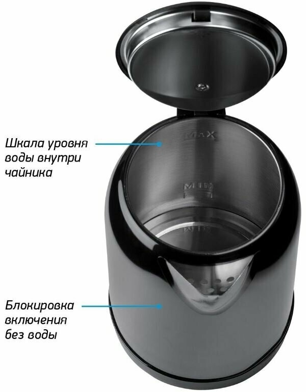 Type: kettle, body material: metal/plastic, volume: 1.80 l, type of heating element: closed, features: 360 degree rotation, water level indicator, power on indication, cord storage compartment