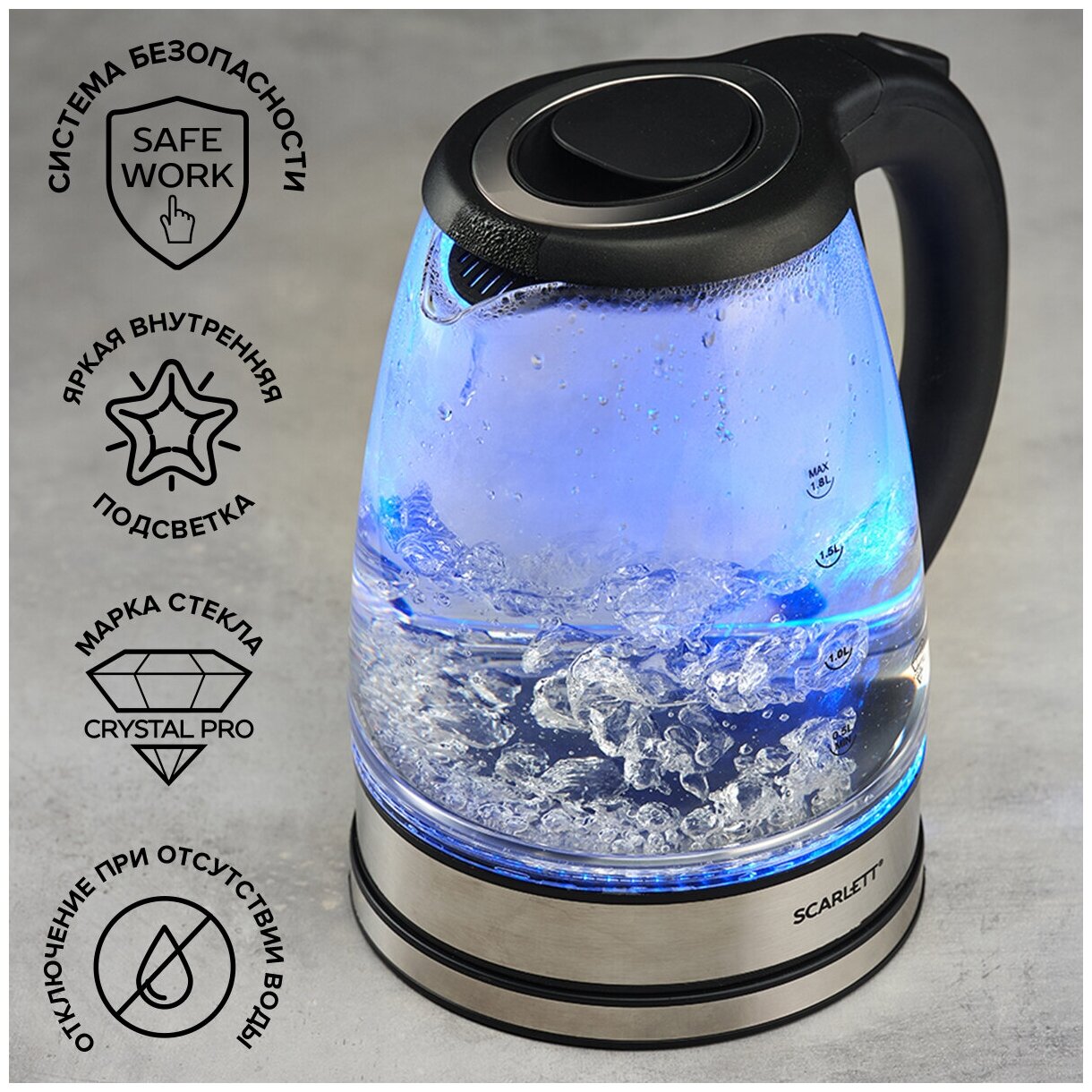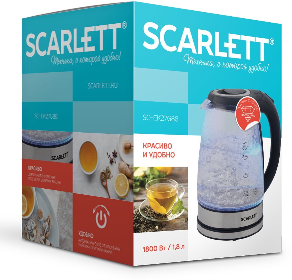 Type: teapot, body material: plastic/glass, volume: 1.80 l, type of heating element: closed, features: 360 degree rotation, water level indicator, power on indication, cord storage compartment,