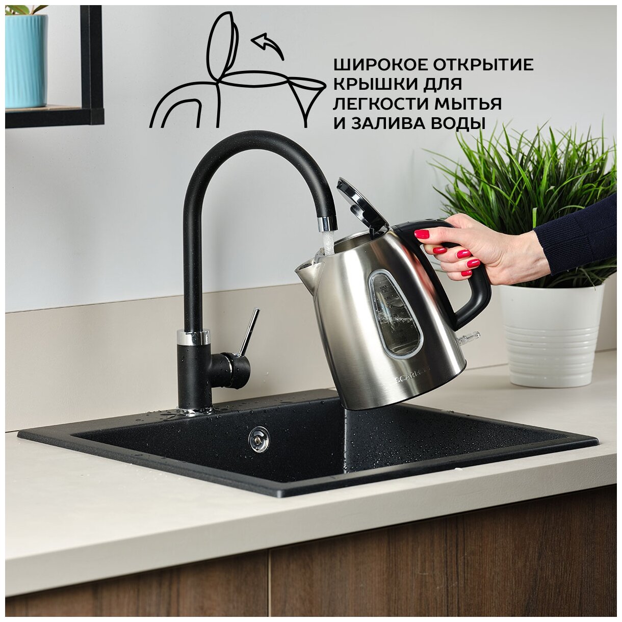 Type: kettle, case material: metal/plastic, volume: 1.80 l, type of heating element: closed, additional functions: keeping warm, features: 360 degree rotation, water level indicator, indication on