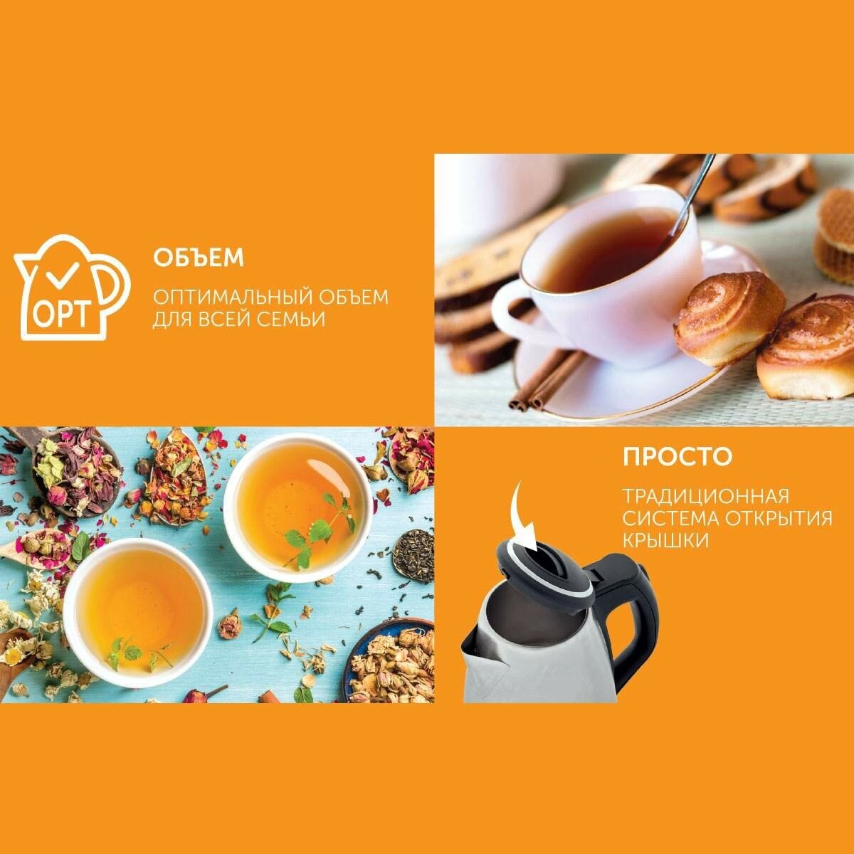 Description: Type: kettle, body material: plastic, volume: 1.70 l, type of heating element: closed, additional functions: keeping warm, features: 360 degree rotation, water level indicator, cord storage compartment