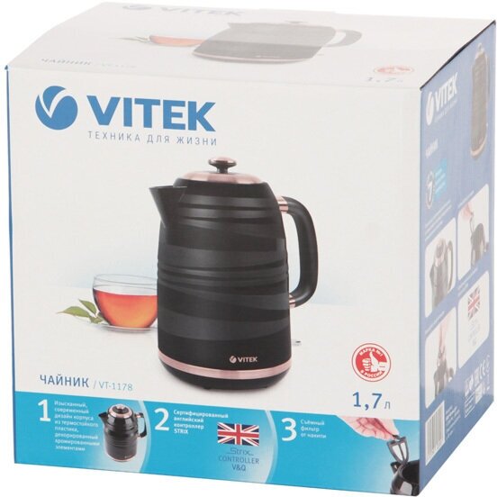 Type: kettle, body material: plastic, volume: 1.70 l, type of heating element: closed, additional functions: keeping warm, features: 360 degree rotation, water level indicator, cord storage compartment