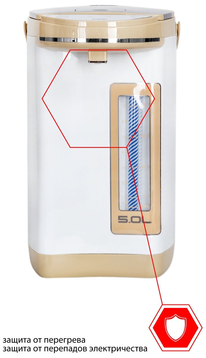 Type: thermopot, body material: plastic, volume: 5 l, type of heating element: closed, additional functions: keep warm, re-boil function, features: 360 degree rotation, level indicator