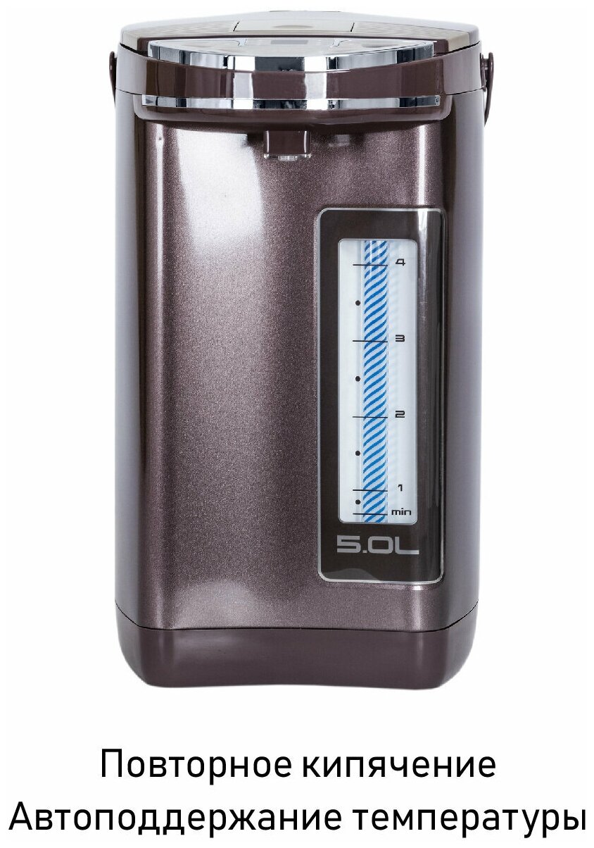 Type: thermopot, case material: plastic, volume: 5 l, type of heating element: closed, additional functions: keeping warm, features: on indication