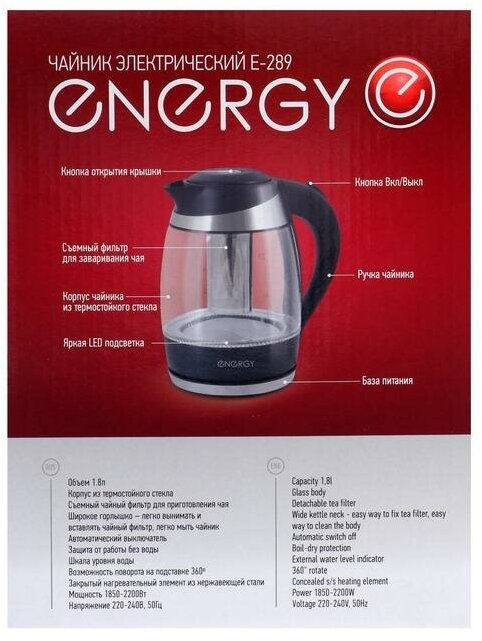 Type: kettle, body material: plastic/glass, volume: 1.80 l, type of heating element: closed, features: 360 degree rotation, brewing filter, water level indicator, cord storage compartment, filter