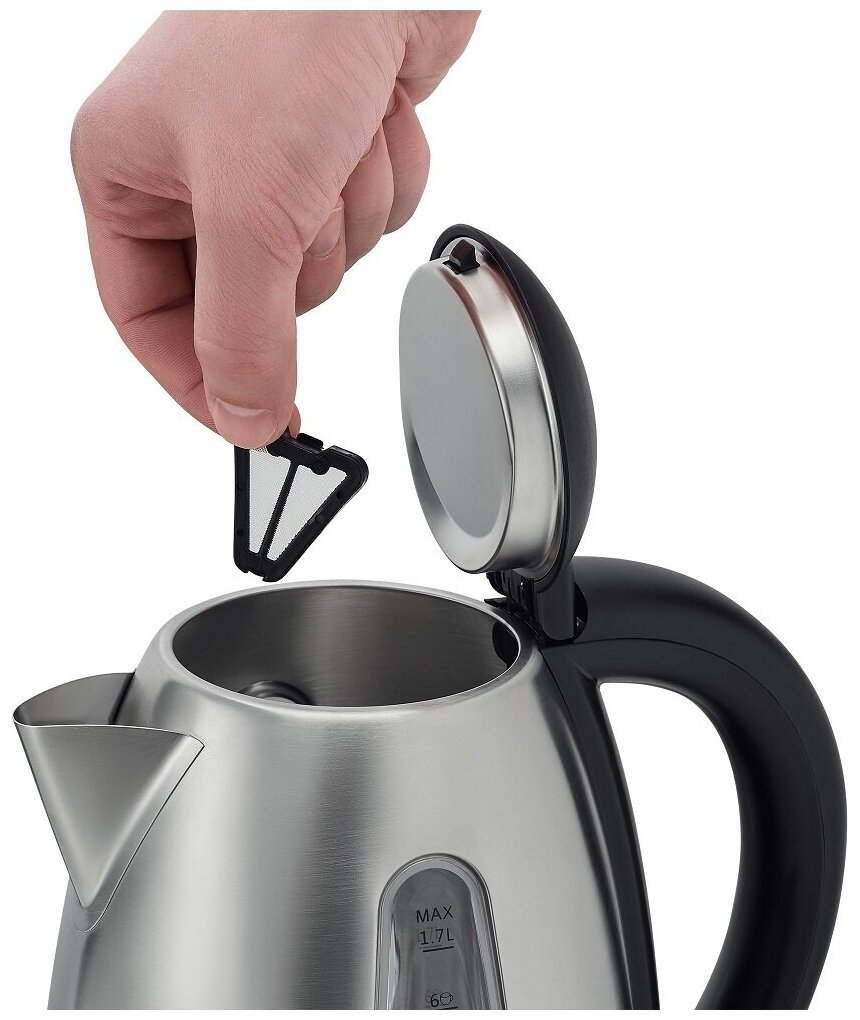 Type: kettle, body material: metal/plastic, volume: 1.70 l, type of heating element: closed, features: 360 degree rotation, water level indicator, cord storage compartment, filter
