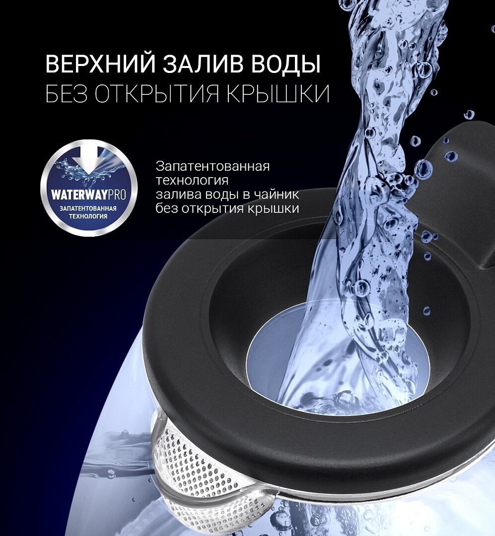 Possibility of top filling of water into the kettle without opening the lid; filter material: stainless steel steel