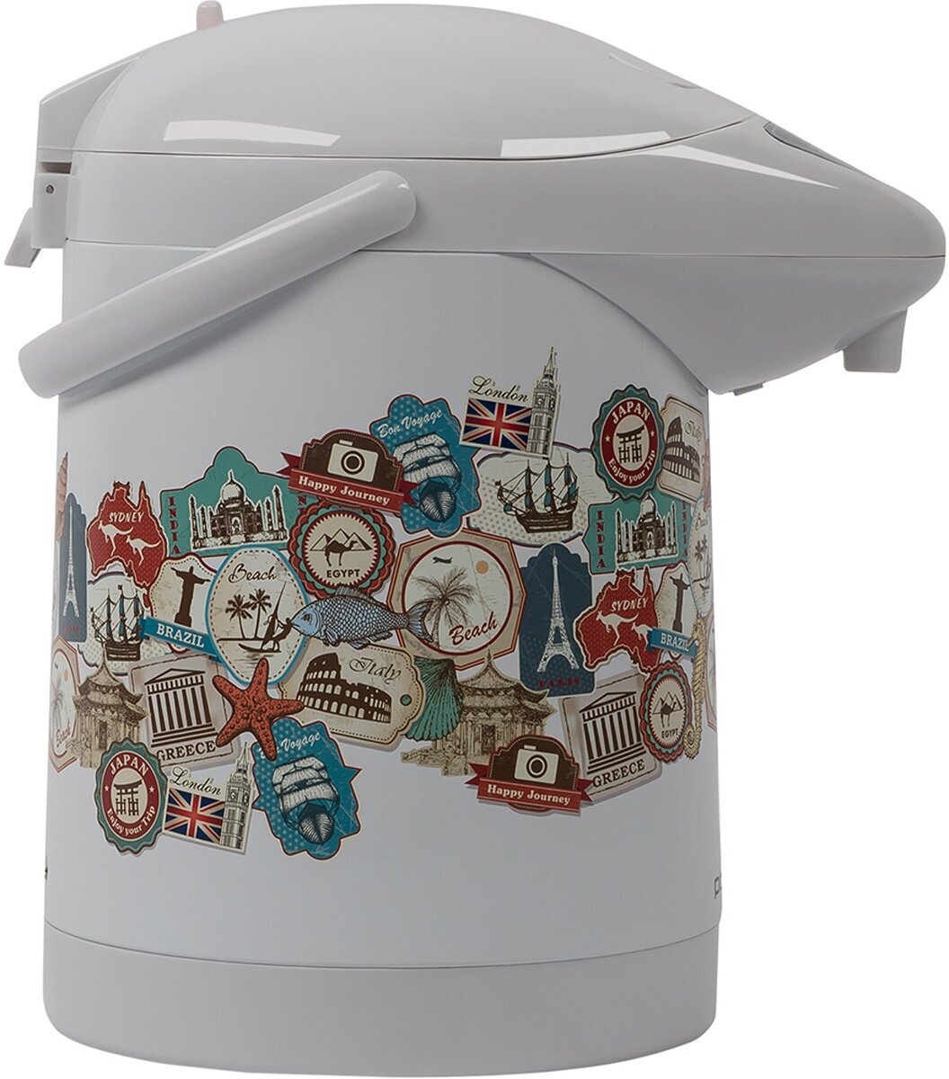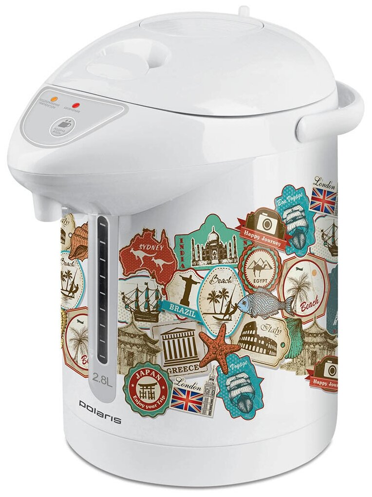 Description: Type: thermopot, body material: metal, volume: 2.80 l, type of heating element: closed, features: 360 degree rotation, double walls, water level indicator, drawing on the body, removable cover