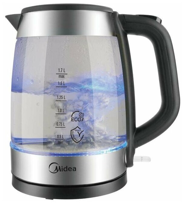 Type: kettle, body material: metal/glass, volume: 1.70 l, type of heating element: closed, features: 360 degree rotation, water level indicator, cord storage compartment