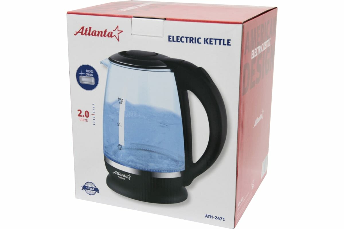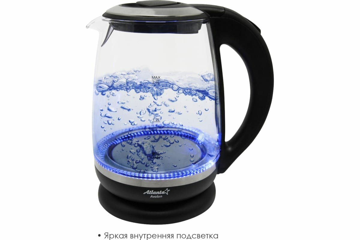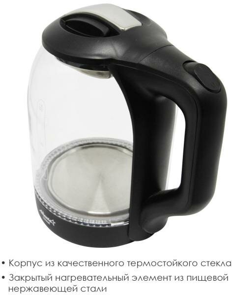 Type: kettle, body material: plastic/glass, volume: 2 l, type of heating element: closed, additional functions: illumination, features: 360 degree rotation, water level indicator, cord storage compartment