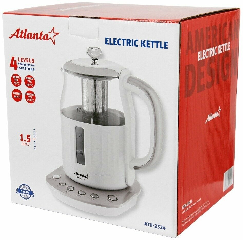 Type: kettle, body material: plastic/glass, volume: 1.50 l, heating element type: closed, features: 360 degree rotation, brewing filter, water level indicator, filter