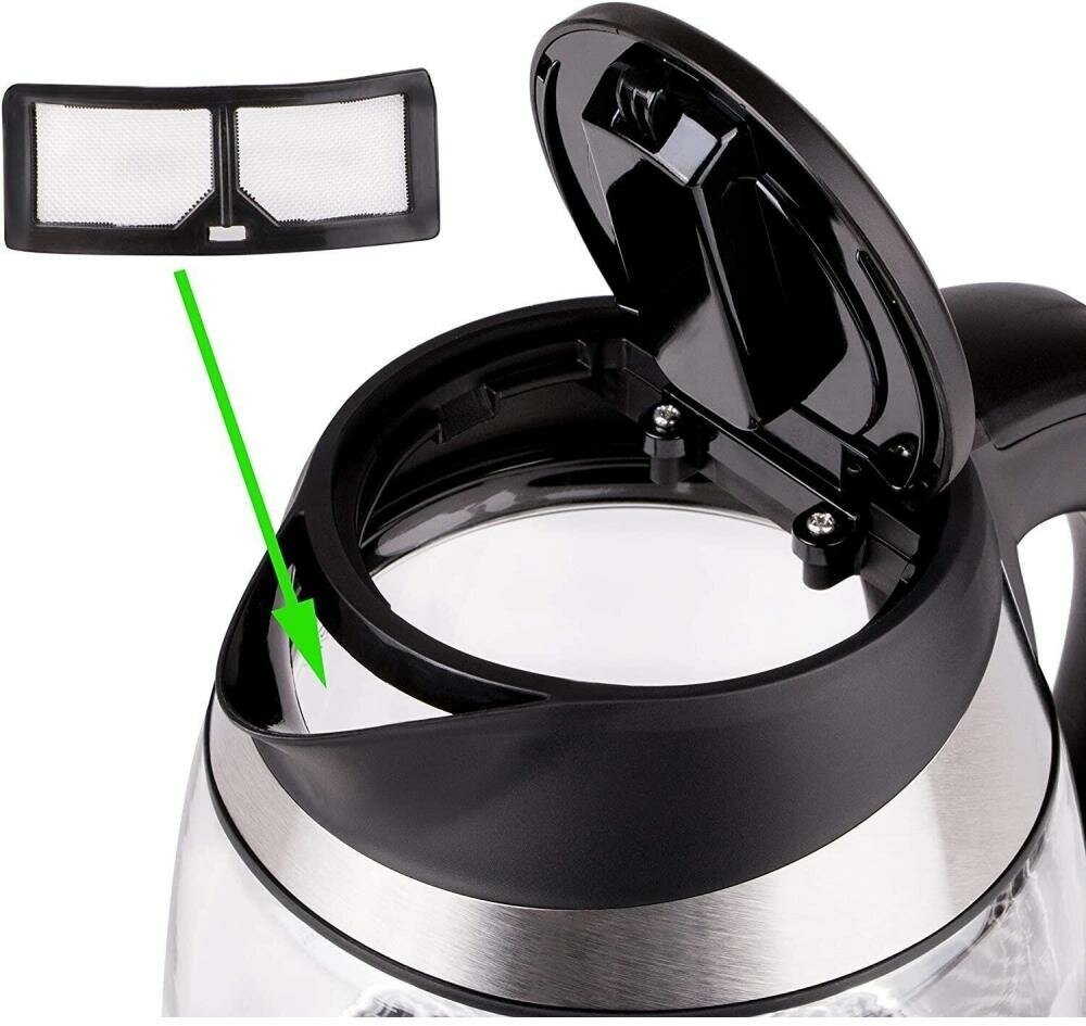 Type: kettle, case material: metal/glass, volume: 1.80 l, type of heating element: closed, additional functions: keeping warm, features: 360 degree rotation, water level indicator, filter