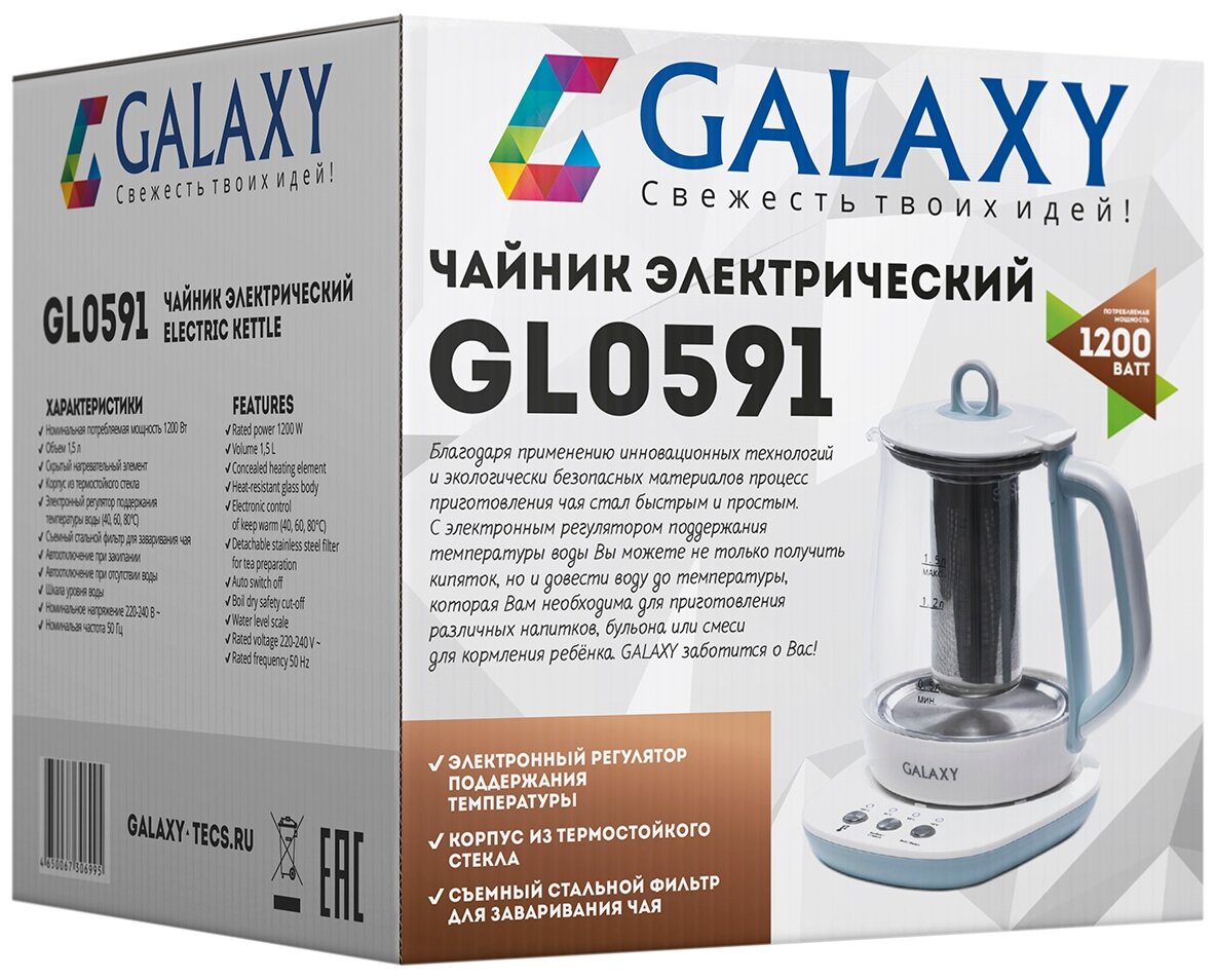 Type: teapot, body material: plastic/glass, volume: 1.50 l, type of heating element: closed, teapot, additional functions: keep warm, features: tea filter, teapot, indica