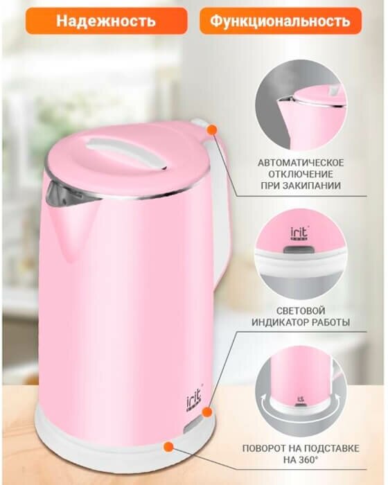 Type: kettle, body material: metal/plastic, volume: 1.80 l, type of heating element: closed, features: 360 degree rotation, double walls, cord storage compartment, thermal pattern