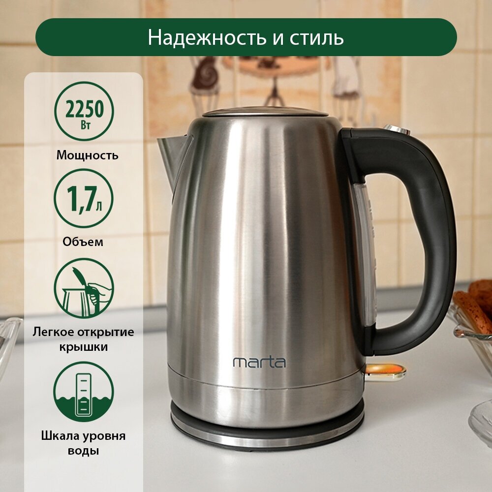 Type: kettle, body material: metal/plastic, volume: 1.70 l, type of heating element: closed, features: 360 degree rotation, water level indicator, power on indication, cord storage compartment