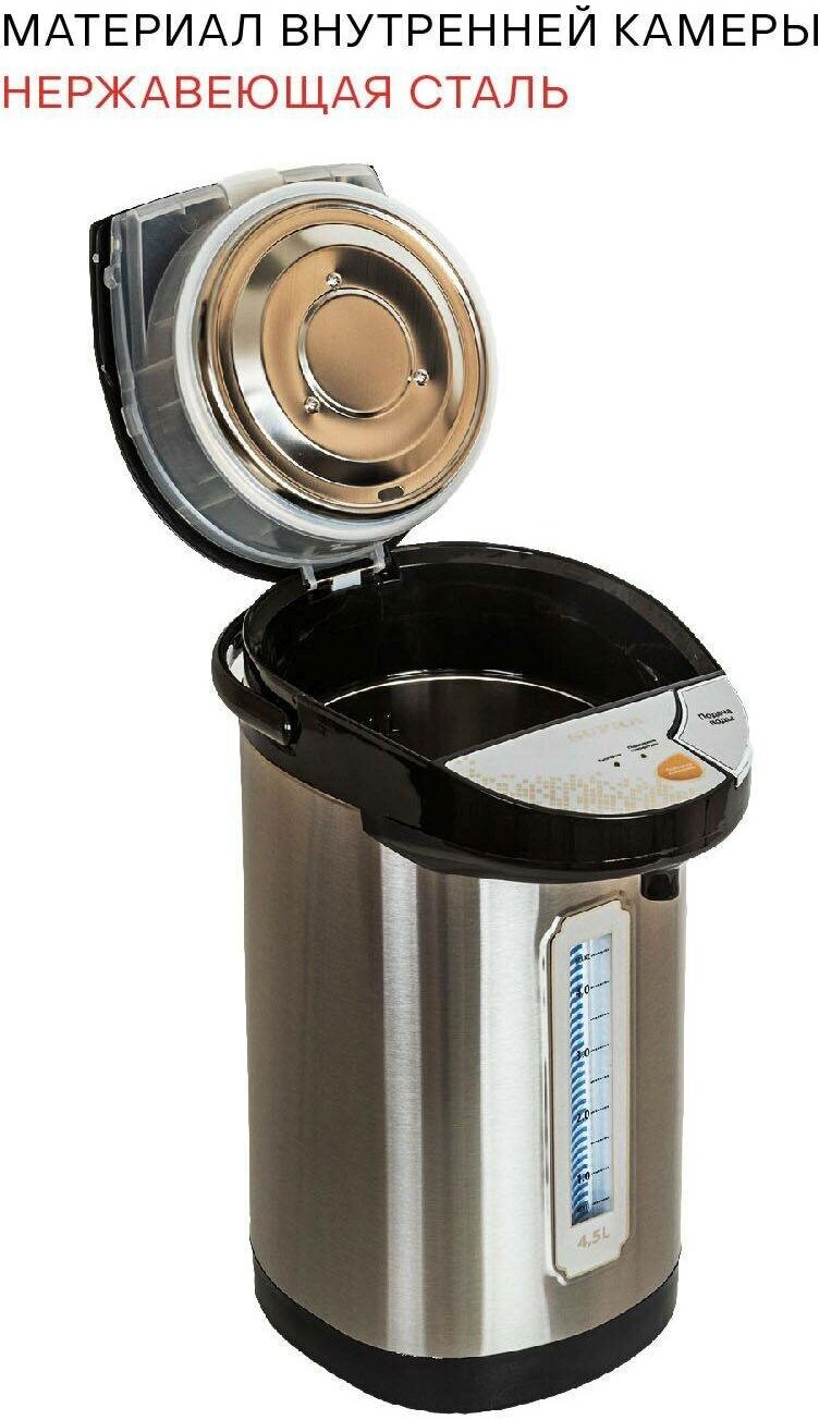 Type: thermopot, case material: metal/plastic, volume: 4.50 l, additional functions: keeping warm, features: 360 degree rotation, water level indicator