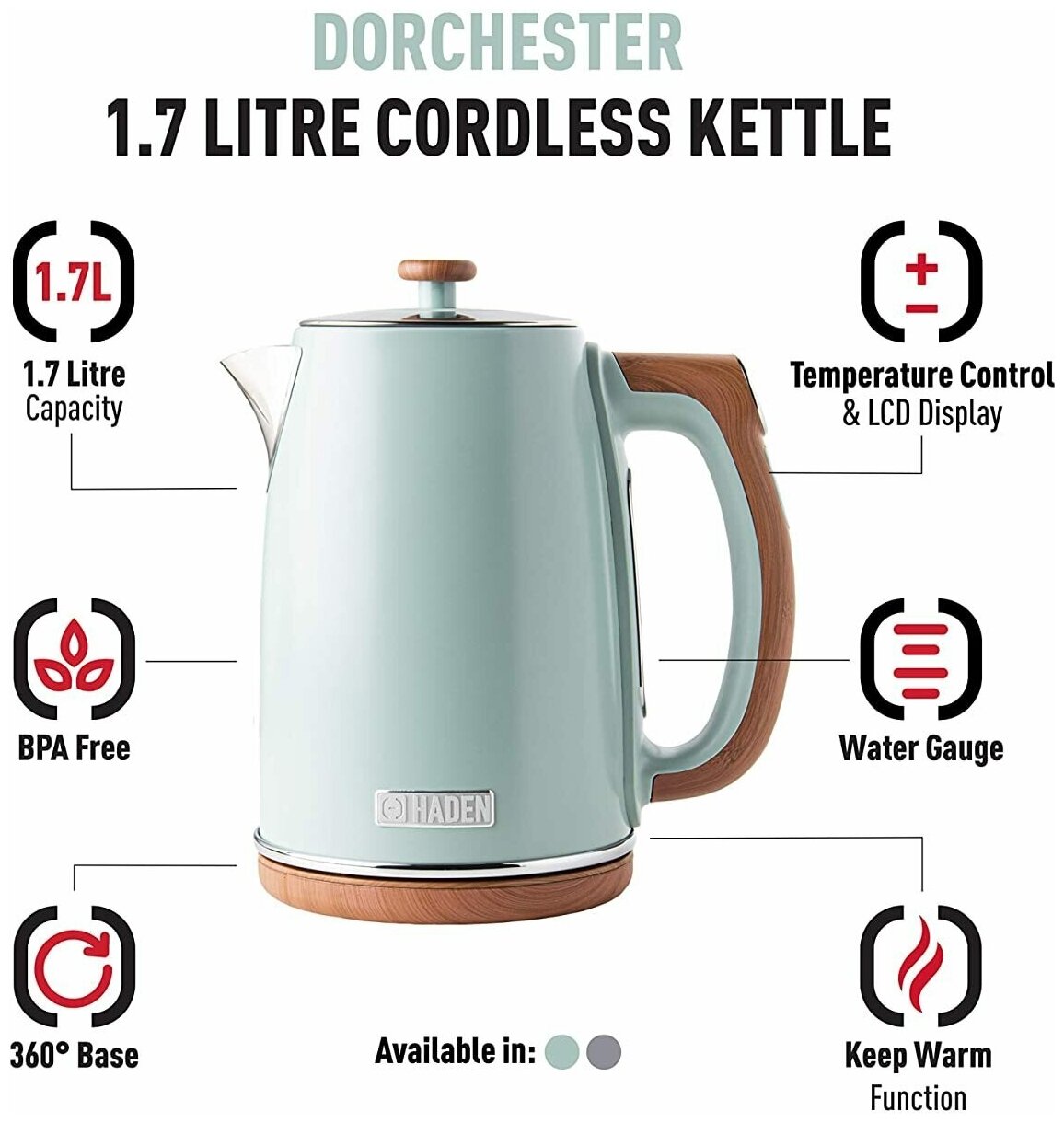 Electric Dorchester Digital Variable Temperature Kettle With Wood Effect Finish, Fast Boil, 3000W, 1.7Litre, Matt Sage Green cd31, green