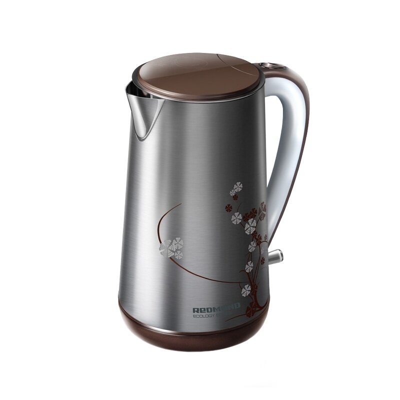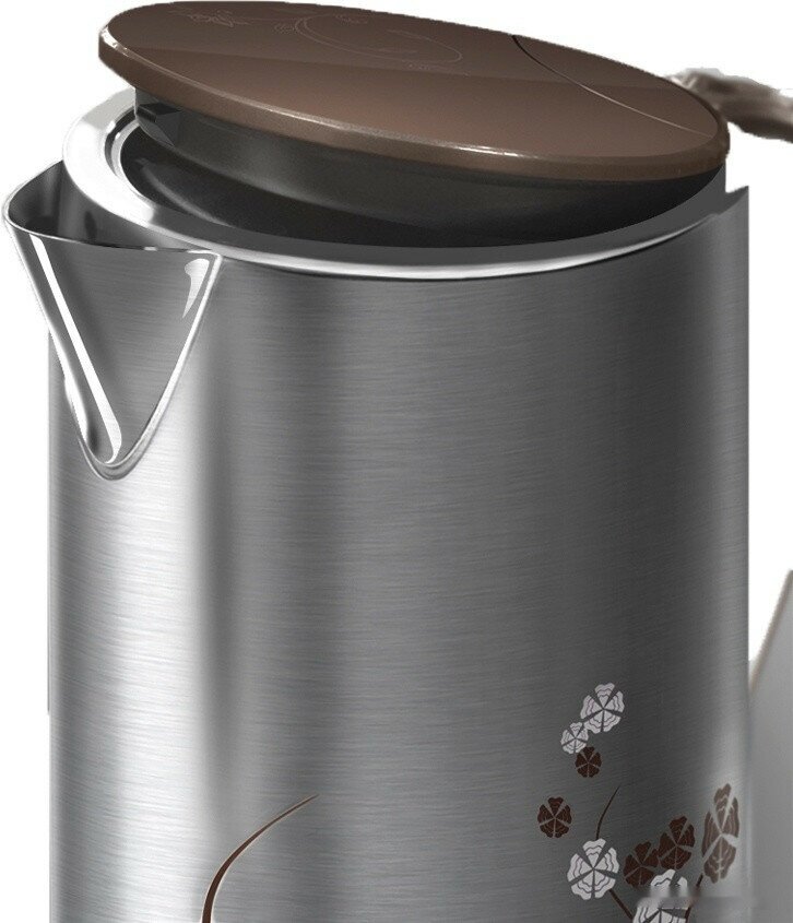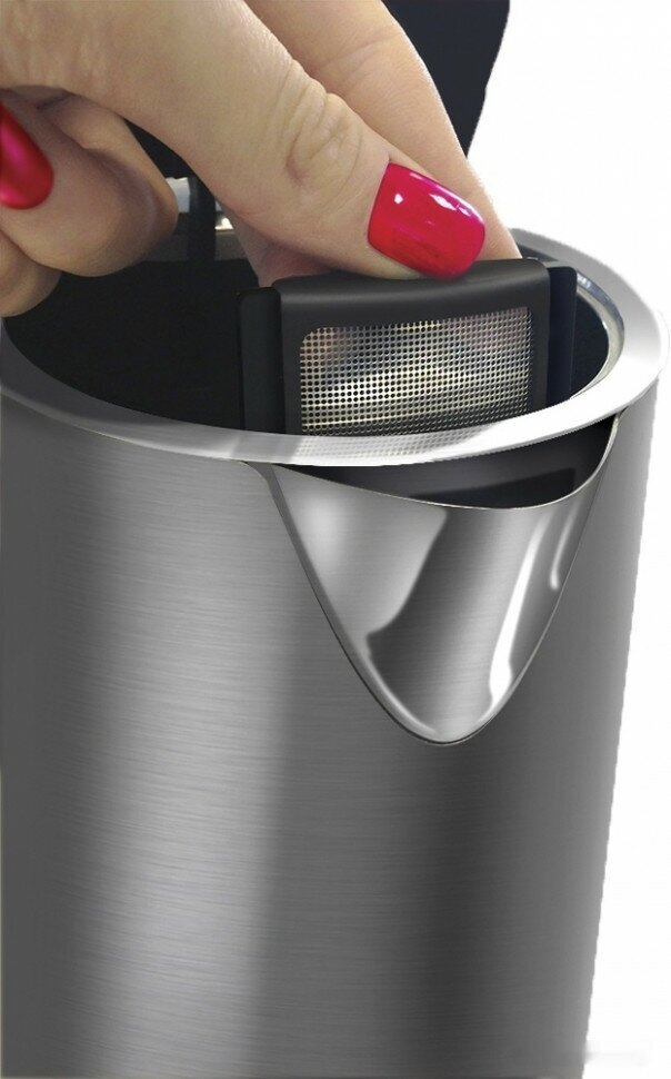 Type: kettle, body material: metal, volume: 1.50 l, features: double walls, water level indicator, cord storage compartment, pattern on the body, removable lid, filter