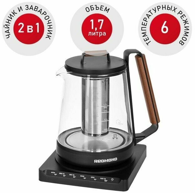Type: kettle, features: 360 degree rotation, brewing filter, water level indicator, touch control, removable lid