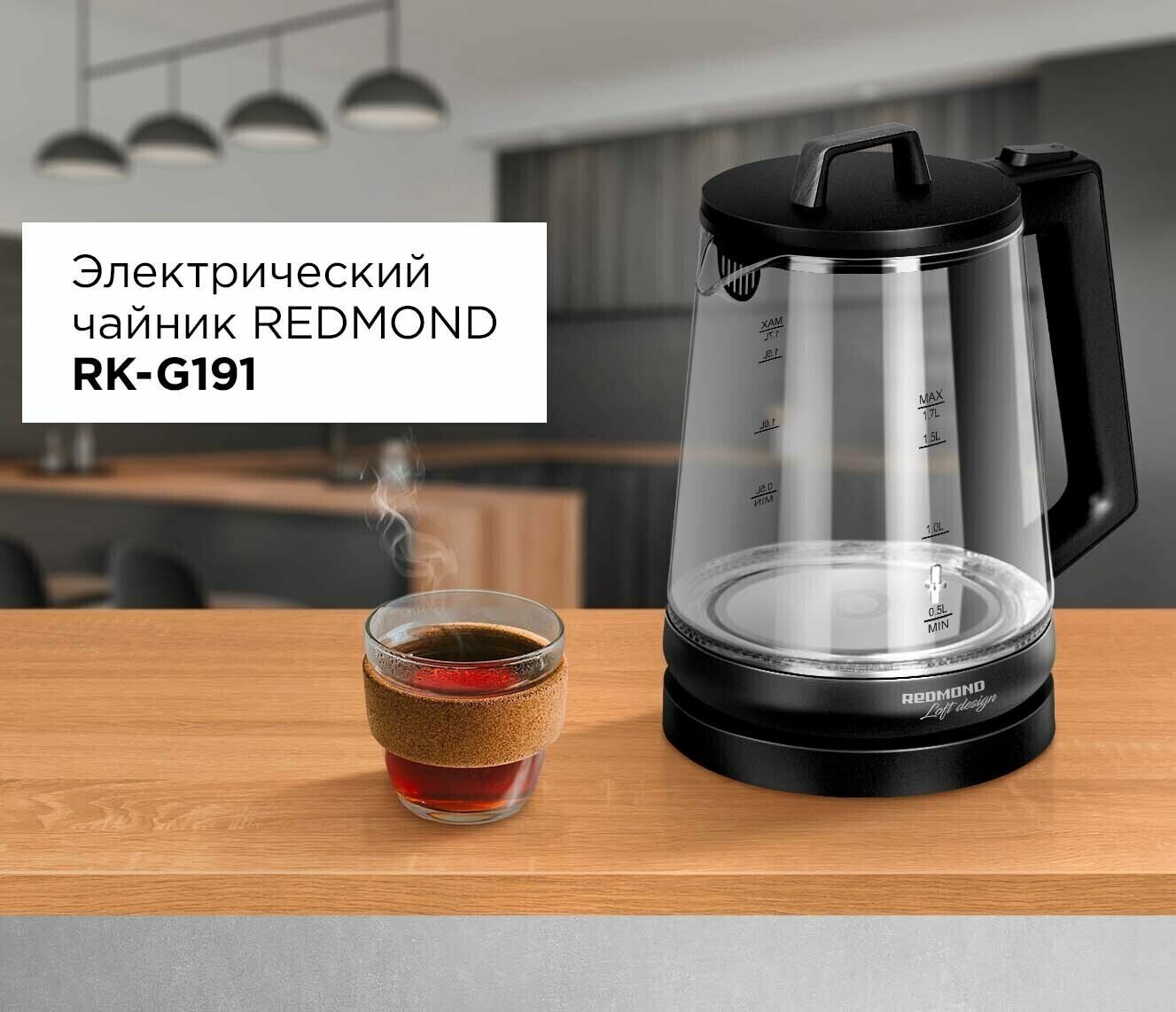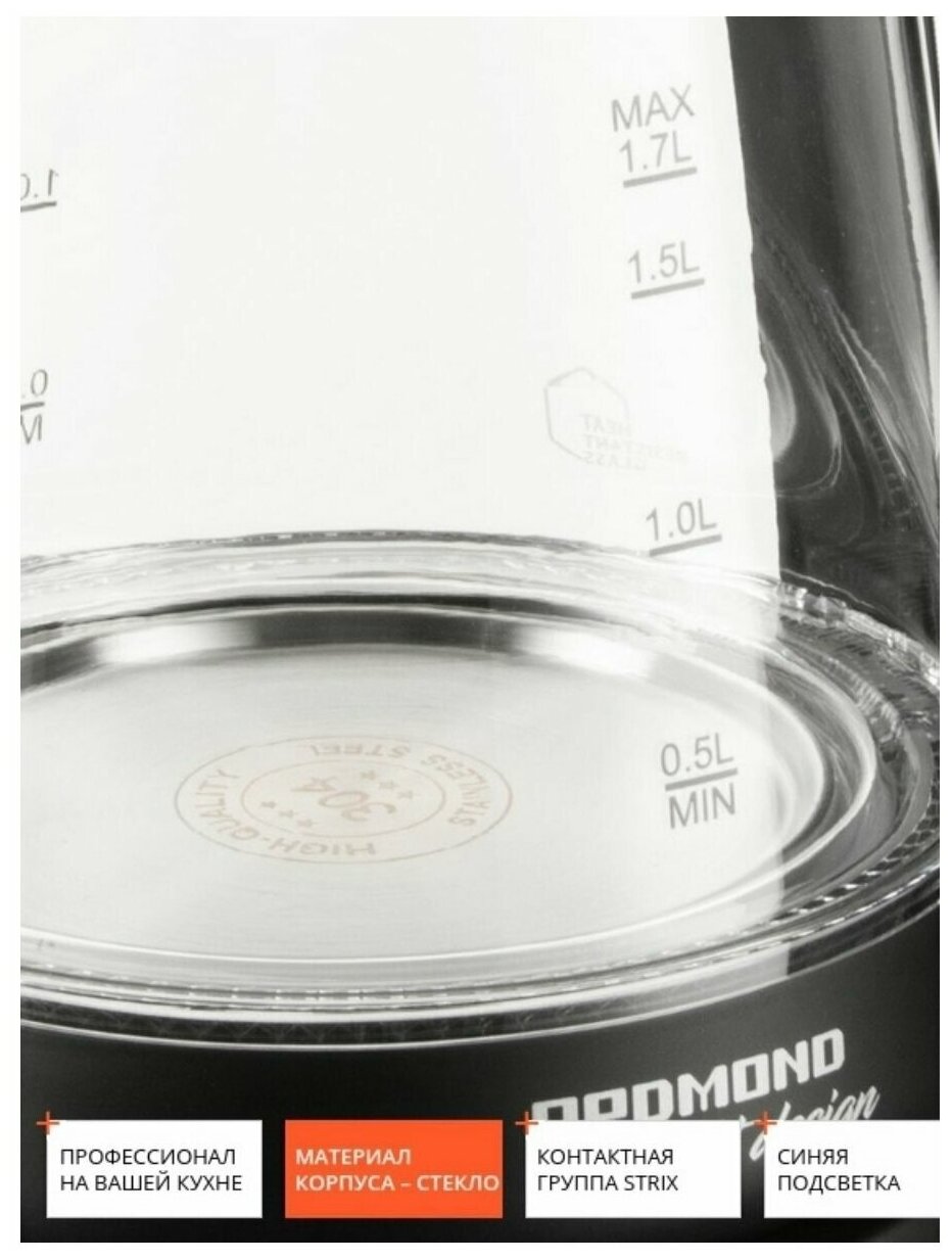 Type: kettle, body material: plastic/glass, volume: 1.70 l, type of heating element: closed, features: 360 degree rotation, water level indicator, on indication, cord storage compartment,