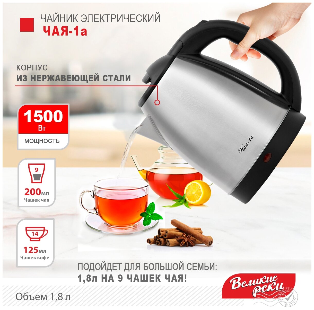 Type: kettle, body material: metal/plastic, volume: 1.80 l, type of heating element: closed, features: 360 degree rotation, filter