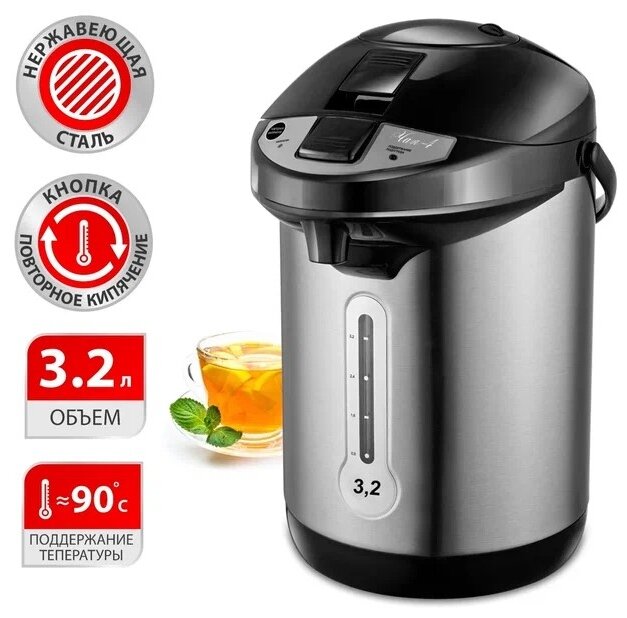 Re-boil button, detachable power cord, hand pump lock against accidental pressing, carrying handle
