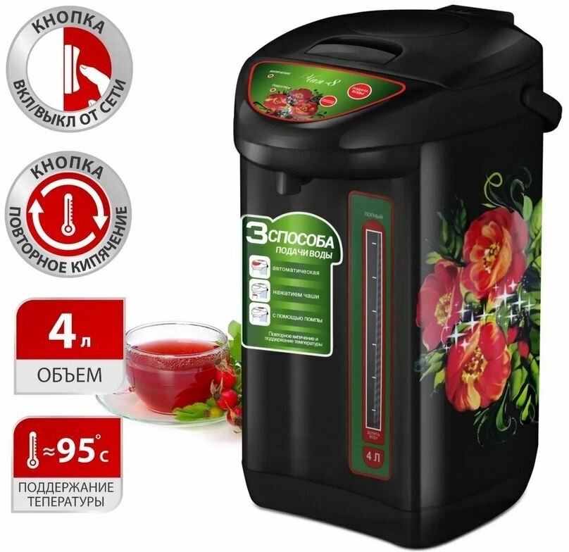 Type: thermopot, case material: metal, volume: 4 l, type of heating element: closed, additional functions: keeping warm, features: double walls