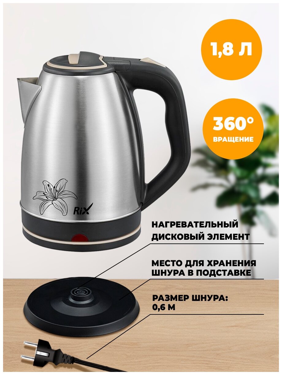 Type: kettle, body material: metal/plastic, volume: 1.80 l, type of heating element: closed, features: 360 degree rotation, on indication, pattern on the body