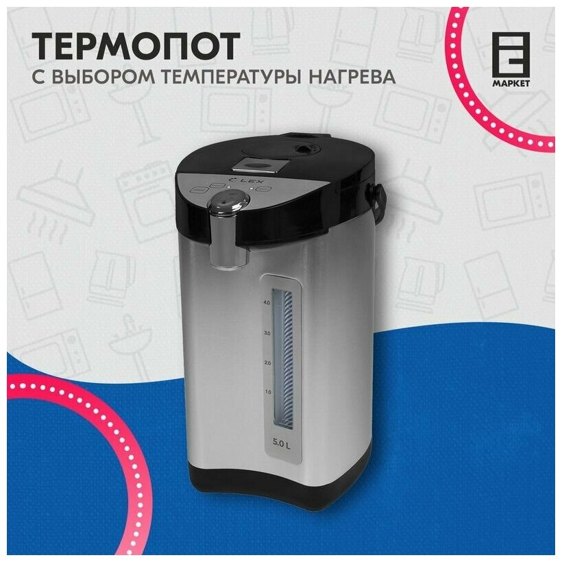 Type: thermopot, case material: metal, volume: 5 l, type of heating element: closed, additional functions: keep warm