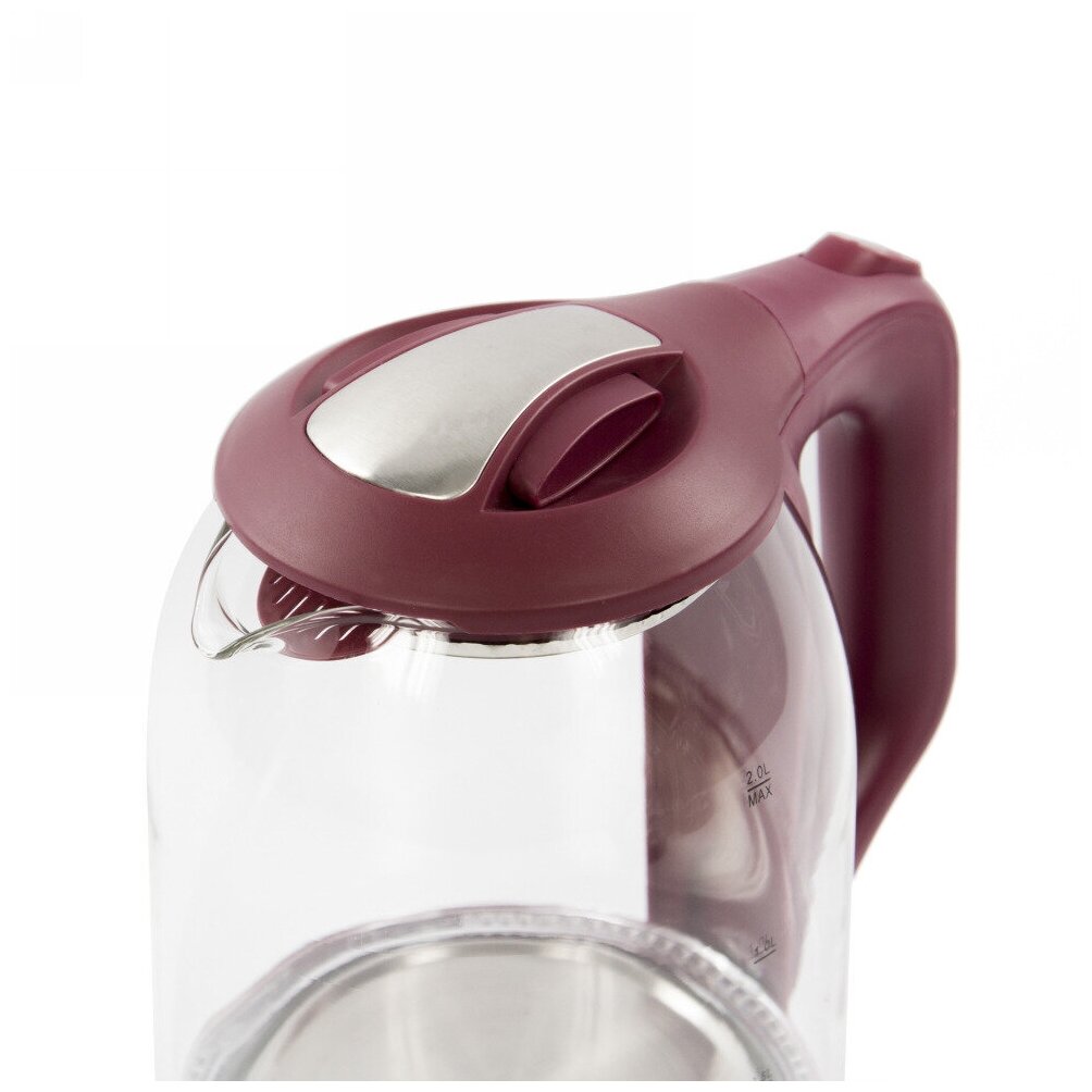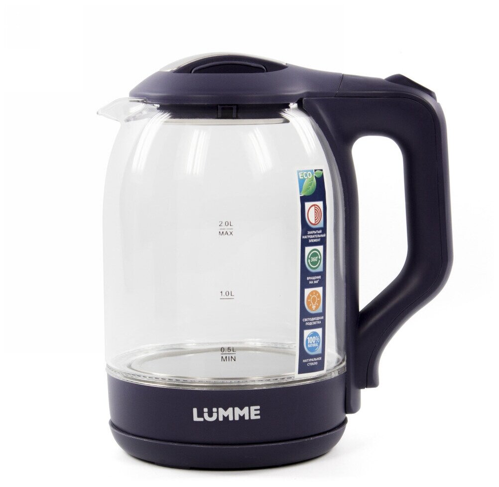 Type: kettle, body material: plastic/glass, volume: 2 l, type of heating element: closed, additional functions: keeping warm, features: 360 degree rotation, water level indicator, storage compartment