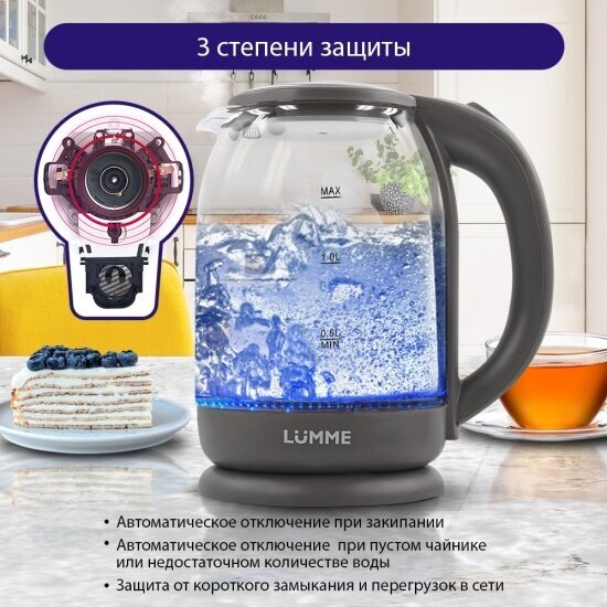 Type: kettle, body material: plastic/glass, volume: 2 l, type of heating element: closed, features: 360 degree rotation, water level indicator, cord storage compartment, filter