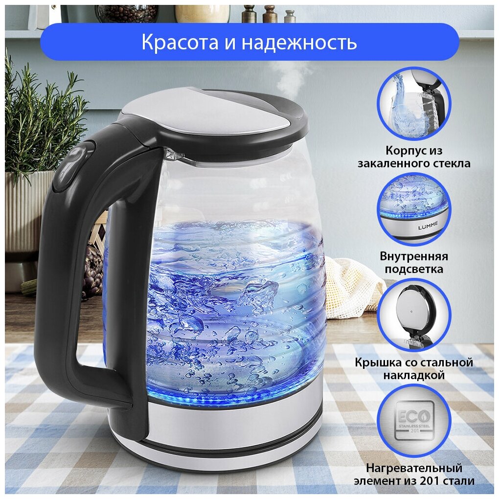 Type: kettle, body material: metal/glass, volume: 2.20 l, type of heating element: closed, features: 360 degree rotation, on indication, cord storage compartment, filter
