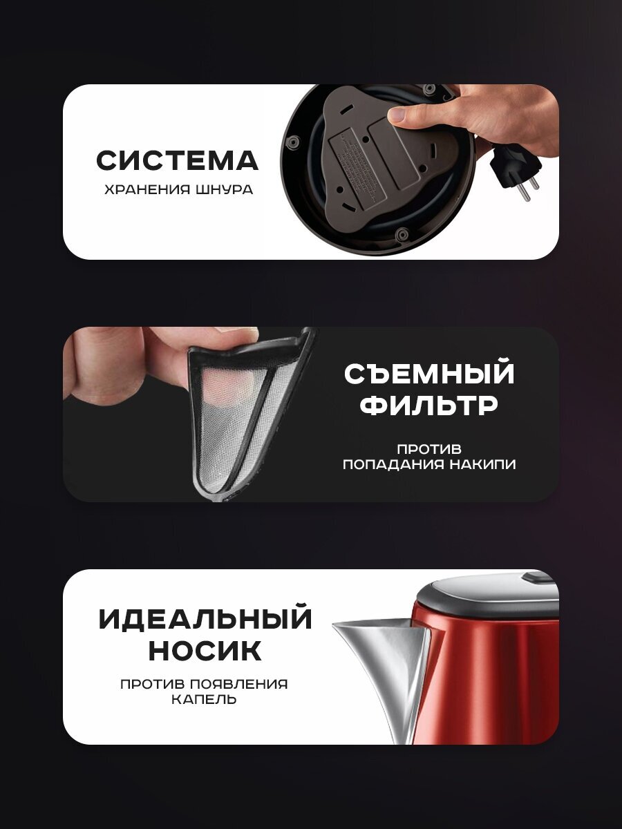 Type: kettle, body material: plastic, volume: 1.70 l, type of heating element: closed, additional functions: keeping warm, features: 360 degree rotation, water level indicator, cord storage compartment