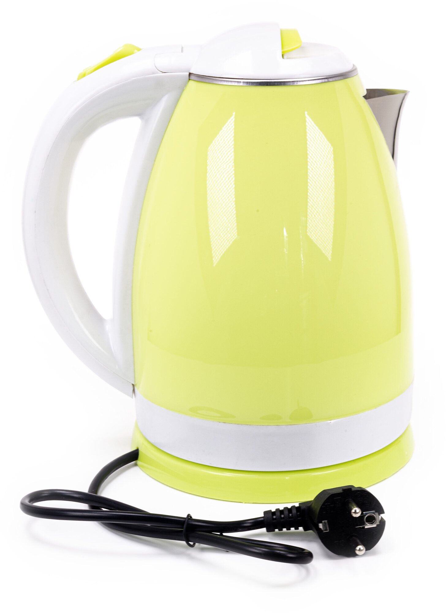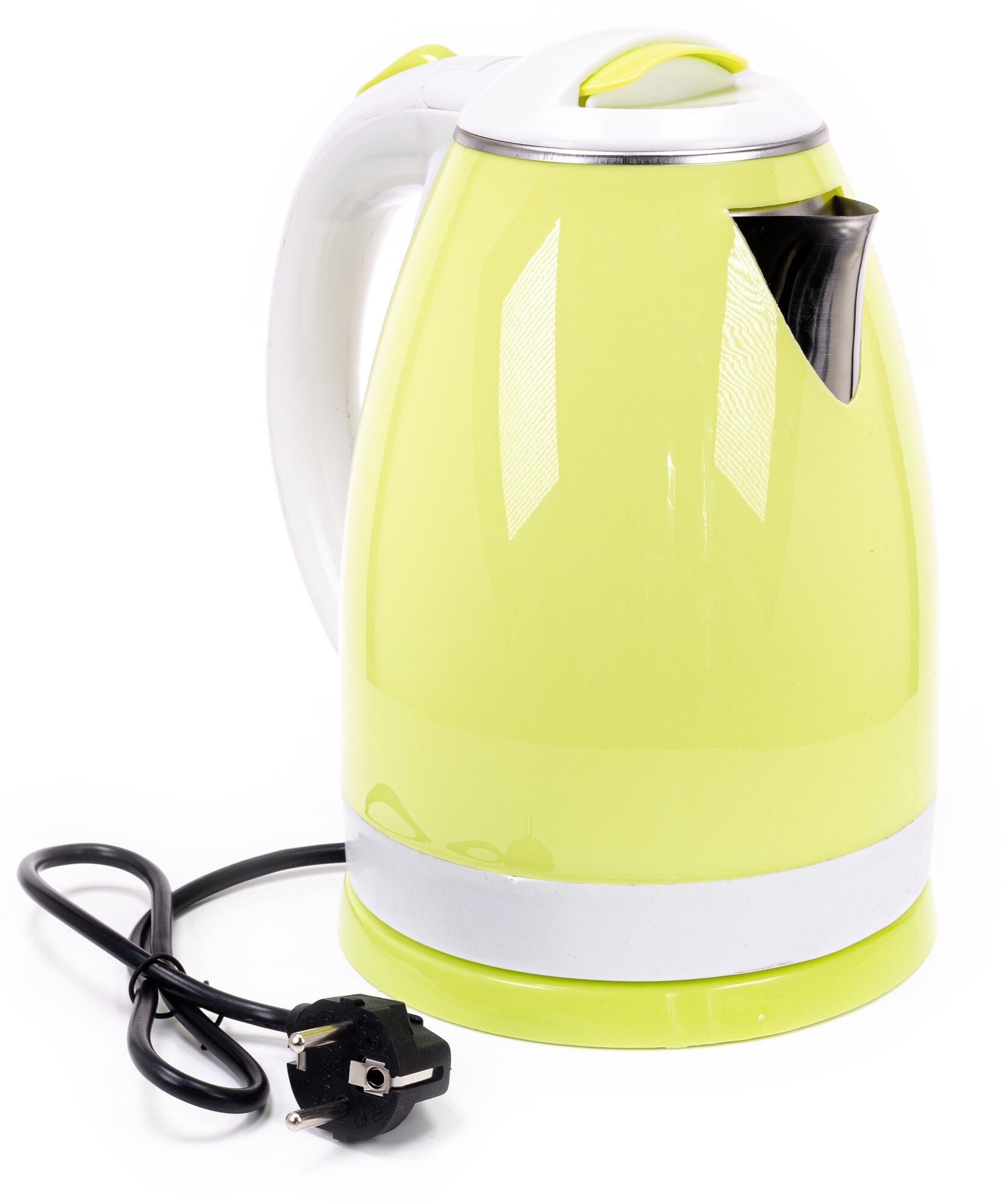 Type: kettle, body material: metal/plastic, volume: 2 l, type of heating element: closed, features: 360 degree rotation, water level indicator, power on indication, cord storage compartment
