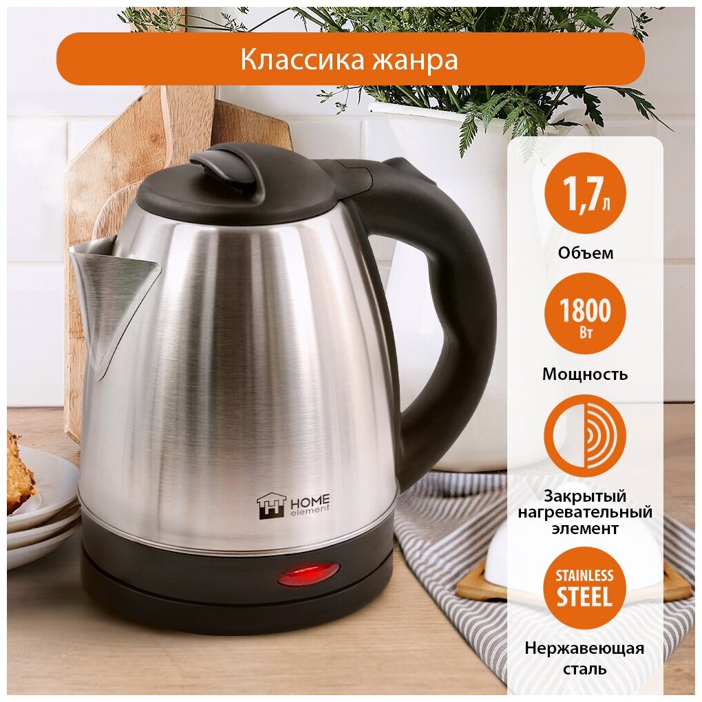 Type: kettle, body material: metal/plastic, volume: 1.70 l, heating element type: closed, features: 360 degree rotation, water level indicator, cord storage compartment