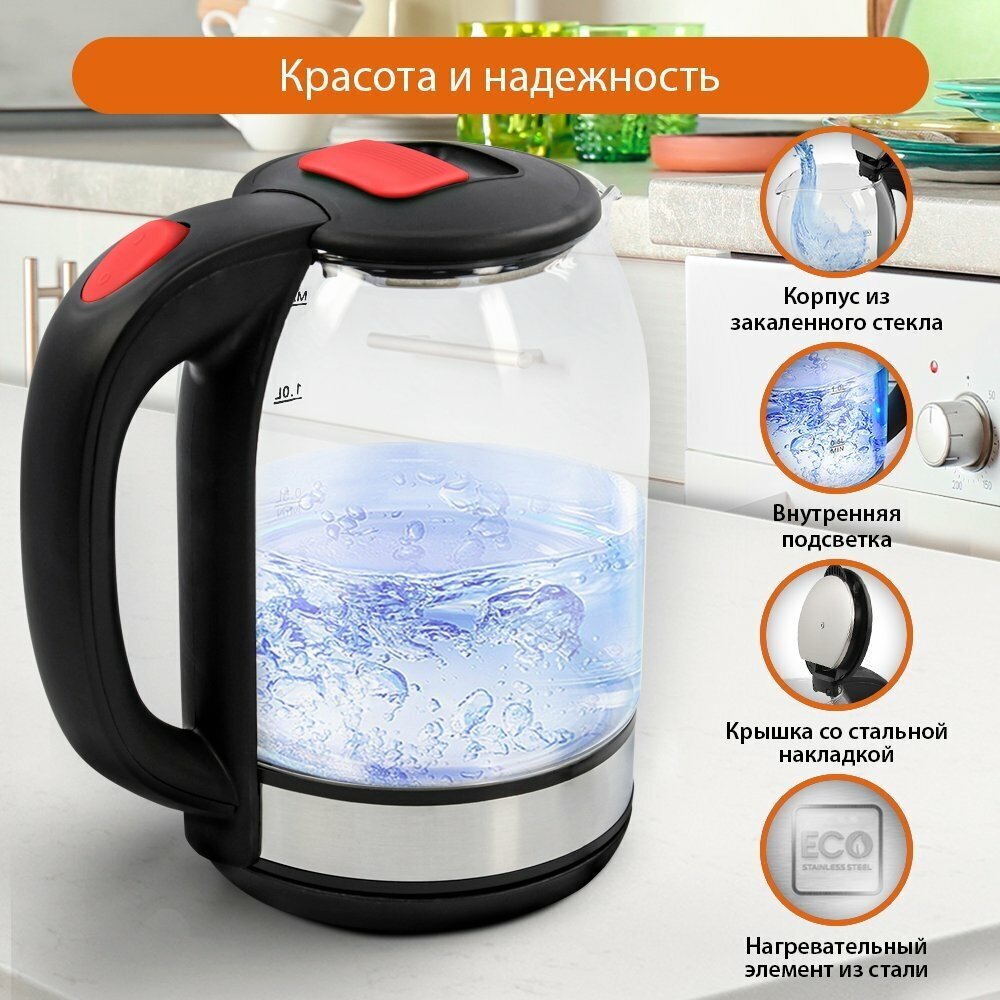 Type: kettle, body material: plastic/glass, volume: 2 l, type of heating element: closed, features: 360 degree rotation, water level indicator, cord storage compartment