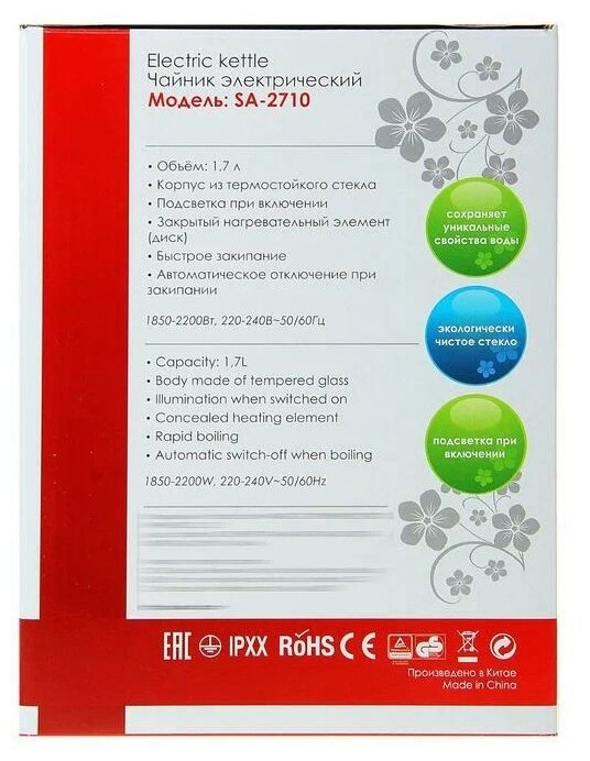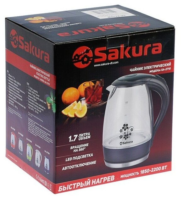 Description: Type: kettle, body material: plastic/glass, volume: 1.70 l, type of heating element: closed, features: 360 degree rotation, water level indicator, drawing on the body, removable lid, filter