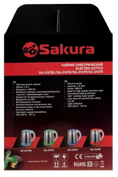 Type: kettle, body material: metal/plastic, volume: 1.80 l, type of heating element: closed, features: 360 degree rotation
